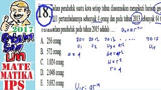 pembahasan soal un sma 2017 matematika IPS ,no 18, pertambahan penduduk deret geometri 18. Pertambahan penduduk suatu kota setiap tahun diasumsikan mengikuti barisan geometri. Pada tahun 2011 pertambahaimya sebanyak 4 orang dan pada ... Watch Now