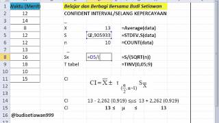 Confident Interval dengan Excel Belajar dan Berbagi bersama Budi Setiawan === Menghitung nilai Confident Interval/ Selang Kepercayaan pada sampel berukuran kecil n kurang dari 30, ... Watch Now