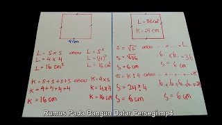 Cara mencari luas persegi jika diketahui sisinya serta cara mencari keliling persegi jika diketahui sisinya. Juga jika yang diketahui adalah keliling atau luas ...
