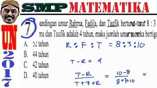 un smp 2017 matematika , pembahasan , no7 menghitung perbandingan Perbandingan umur Rahma, Fadila, dan Taufik berturut-turut 8 : 3 : 10. Jika selisih umur Rahma dan Taufik adalah 4 tahun, maka jumlah uang mereka bertiga ... Watch Now